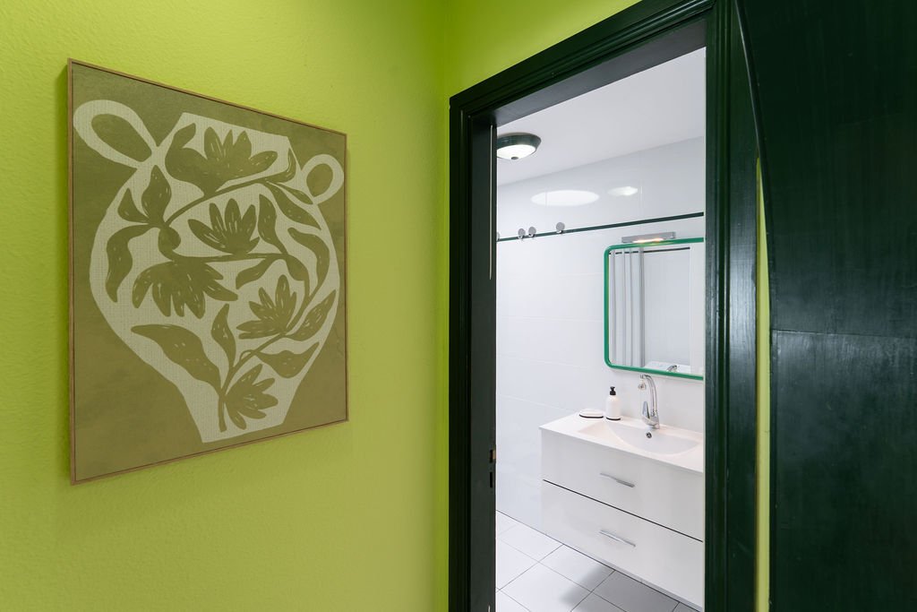 Wohnzimmer mit hohen Decken und einer offenen modernen Küche. Vor dem Wohnzimmer befindet sich die überdachte Terrasse. Das Schlafzimmer hat eingebaute Schränke mit Schiebetüren. Das Bad, sowie die Küche sind neu saniert und es hat eine ebenerdige Dusche. Neben der Küche finden Sie einen Abstellraum (Solana) der vielfältig genutzt oder in die Wohnbereiche integriert werden kann.