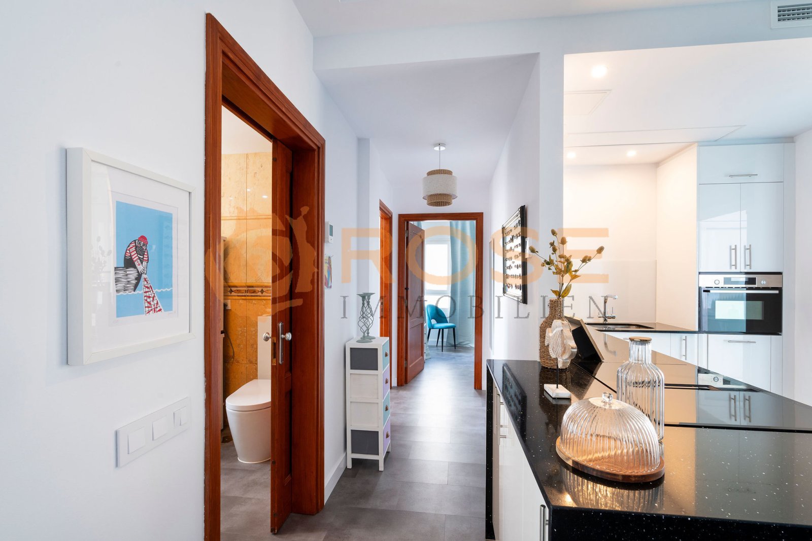 Lassen Sie sich begeistern für dieses Apartment mit Studio. Es wurde vor kurzem vollständig renoviert und modern gestaltet, ohne traditionelle Elemente zu übergehen. Diese wurden gekonnt in das moderne auf die Zukunft ausgerichtete Innendesign integriert, das Ergebnis ist eine gelungene Fusion von Bestand und neuen Elementen. Dieses ungewöhnlich große Apartment bietet Ihnen viel Platz, es hat drei Schlafzimmer, eines davon auch als Studio mit eigenem Bad und Anschluss für eine Küchenzeile nutzbar. Der Studiobereich kann separat vermietet werden oder in die Wohnung integriert werden und selbst genutzt werden, z. B. als Gästebereich. Sie können zwischen zwei großen Terrassen wählen, die vordere mit Meerblick kann auch zu einer Art Wintergarten mit stabilen Jalousien werden. Die ganze Wohnung ist zentral klimatisiert und es sind keine Klimageräte in den einzelnen Zimmern zu sehen. Die Küche ist offen zum Wohn- und Essbereich gestaltet und hat alle Einbaugeräte. Zum Apartment gehört ein eigener überdachter Stellplatz, die kleine und feine Anlage hat einen Gemeinschaftspool und einen Aufzug. Die Wohnung ist ohne Barriere zu erreichen.