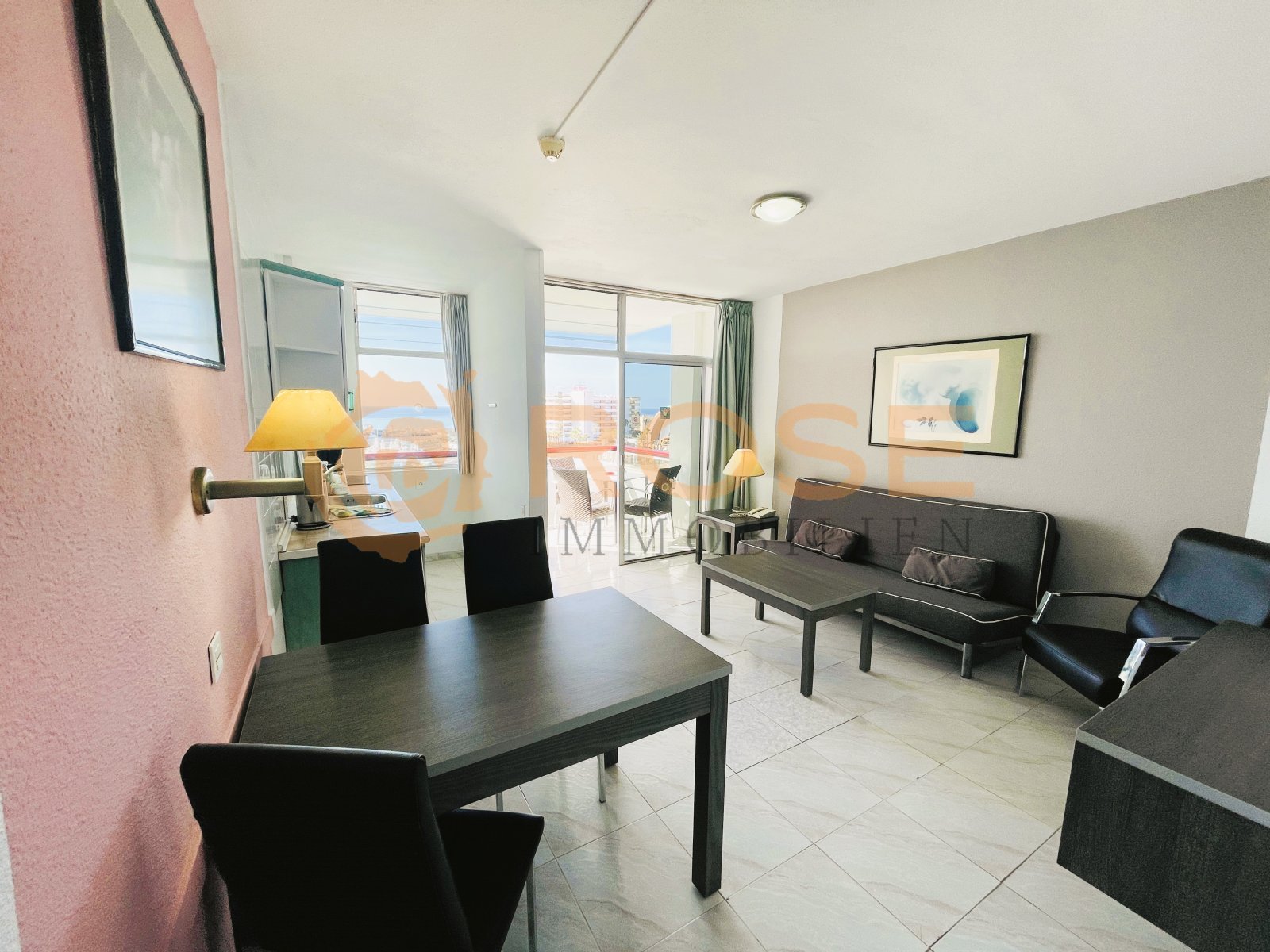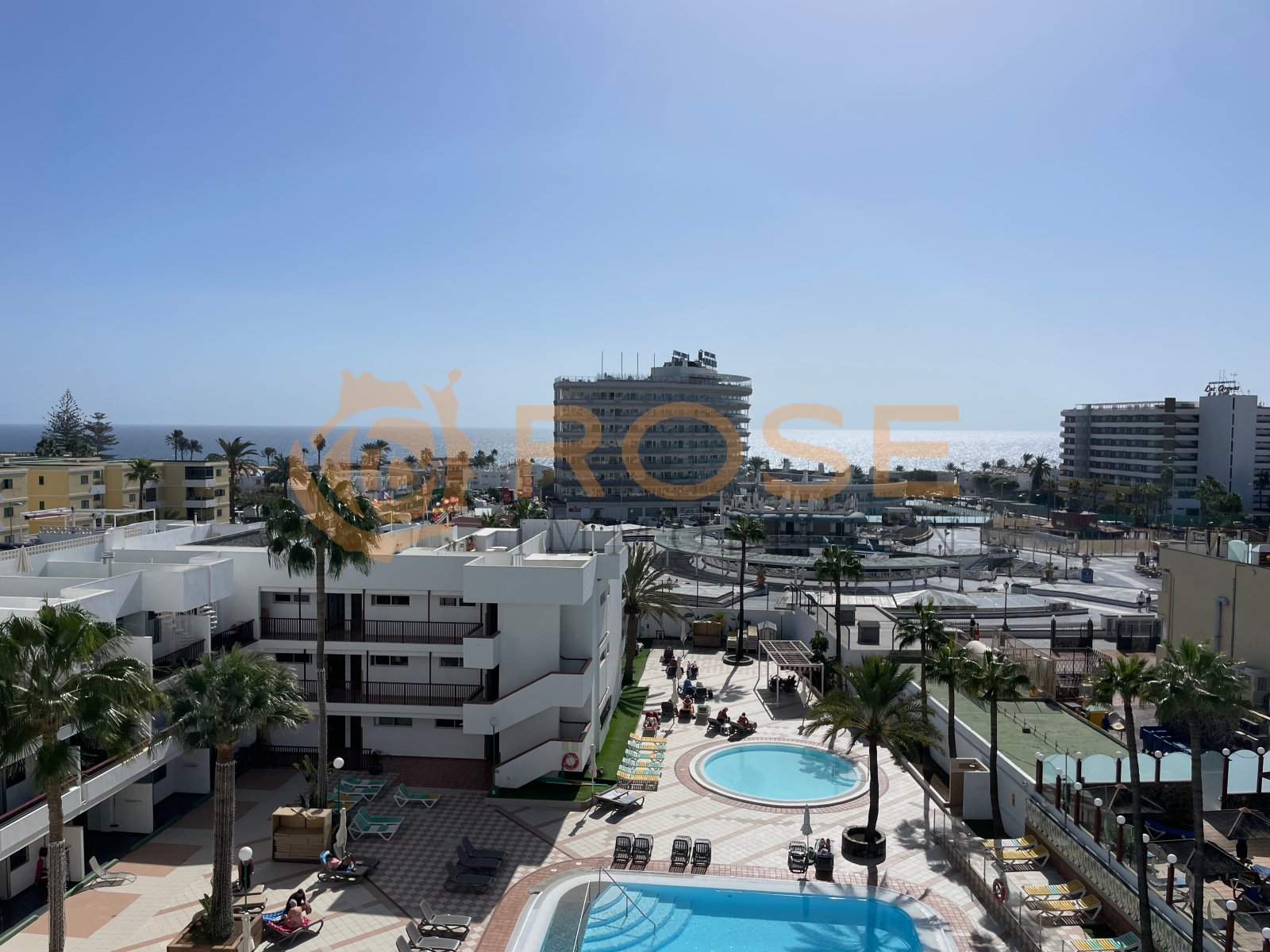 Rose Real Estate - Your real estate agent in Gran Canaria presents a unique sea view in the middle of Playa del Inglés. Enjoy your holidays in this wonderfully designed corner apartment with storage room and an exceptionally large balcony. The bathroom has been renovated and features a floor-to-ceiling shower.