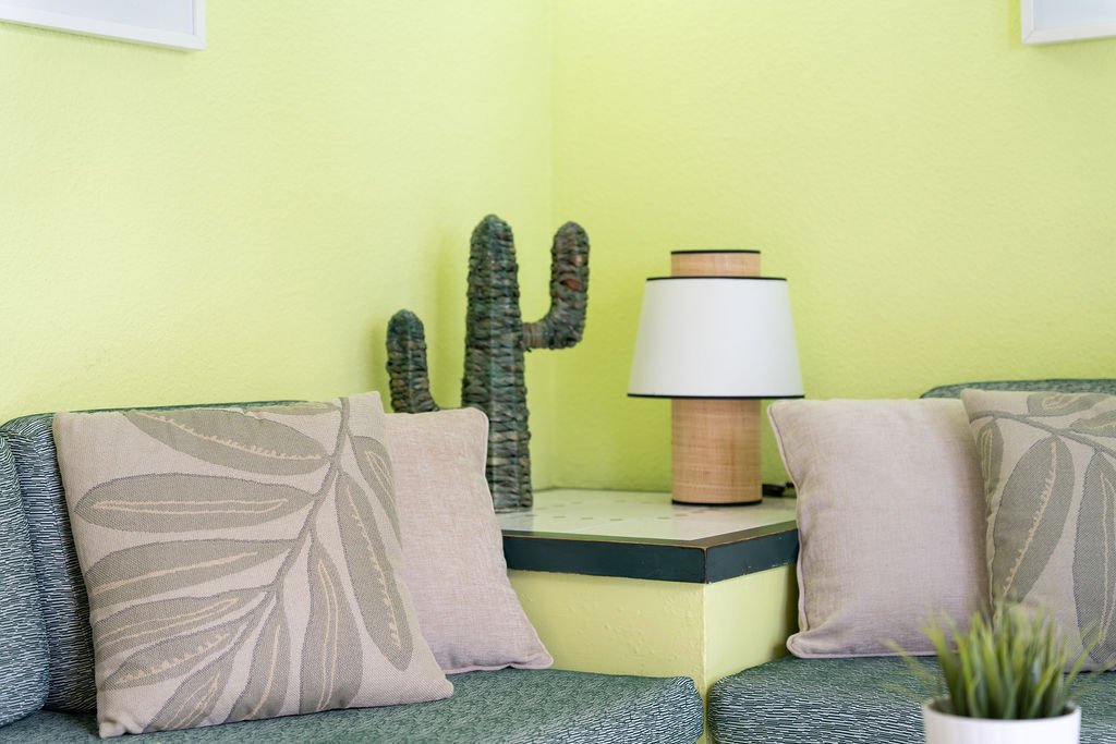 Living room with high ceilings and an open modern kitchen. In front of the living room is the covered terrace. The bedroom has built-in closets with sliding doors. The bathroom and the kitchen have been newly renovated, and there is a ground-level shower. Next to the kitchen, you will find a storage room (Solana) that can be used in various ways or integrated into the living areas.