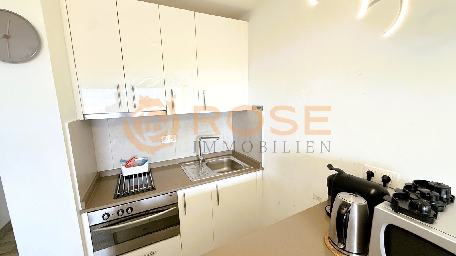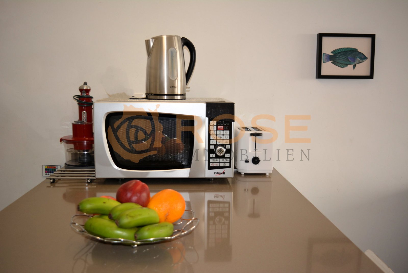 The holiday apartment is sold furnished. Well-equipped kitchen with washing machine, oven, microwave. Air conditioning. The bathroom with shower has an exterior window.