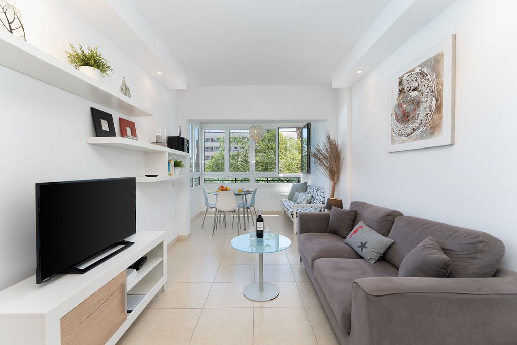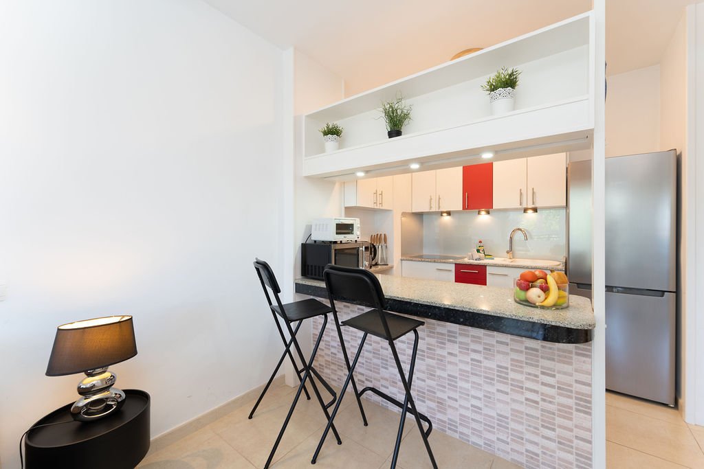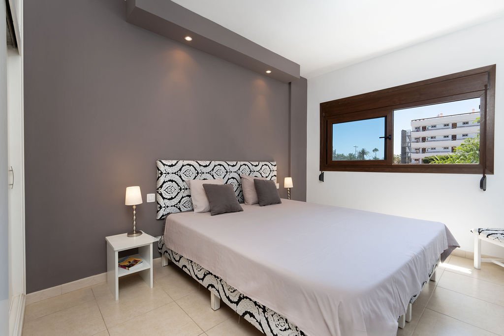 El piso de vacaciones de un dormitorio, de gestión privada, está situado en la 1ª planta con vistas al jardín y a las palmeras