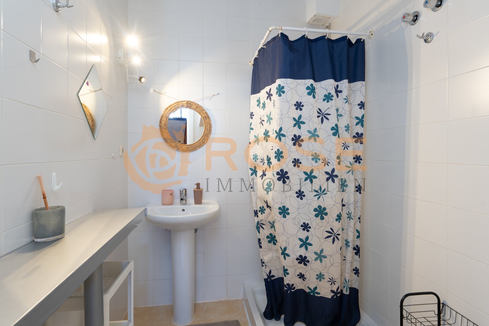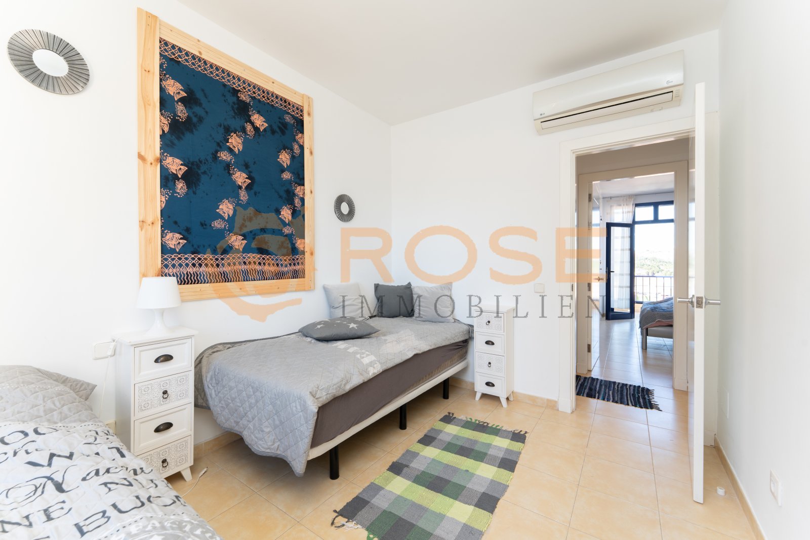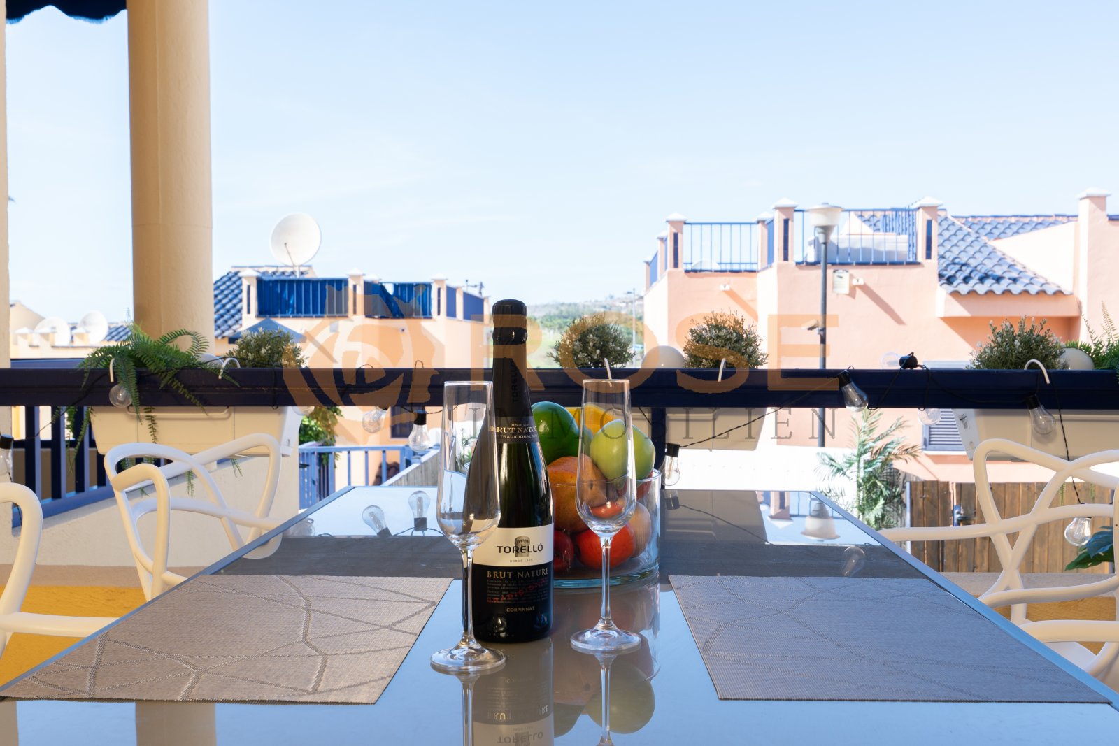 La planta de entrada está rodeada por dos terrazas. En esta planta se encuentran la sala de estar espaciosa y la cocina abierta. En el piso superior hay dos dormitorios, uno con un gran balcón, numerosos armarios empotrados, un baño con ducha a ras de suelo y ventana, y otro balcón con vistas al campo de golf y al mar.