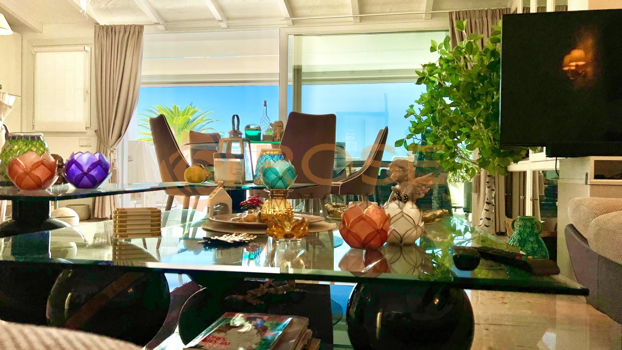 Rose Immobilien - Votre agent immobilier à Gran Canaria présente ce bungalow élégant et luxueux situé dans l'emplacement privilégié de Playa del Inglés, offrant une vue sur les dunes et la mer à l'horizon.